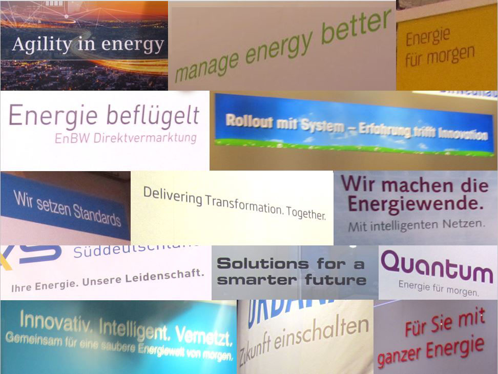 Nicht zu schaden, heißt aber nicht, positiv zu wirken. Viele Claims und noch mehr Slogans kommen über Irrelevanz, Beliebigkeit, Austauschbarkeit und banalem Phrasendreschen nicht hinaus und verpuffen wirkungslos oder sind evtl. deswegen sogar kontraproduktiv. Sieht man sich eine kleine Sammlung von Claims/Messeslogans, aufgenommen auf einer eher kleinen Fachmesse, der e-World Energiemesse in Essen!), dann wird klar, dass es wohl nicht schaden würde, hätte man sie nicht.